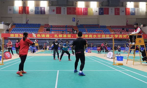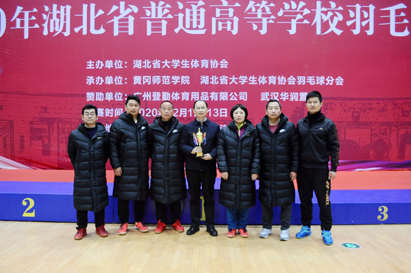 喜报:学校教职工代表队参加2020年湖北省普通高等学校羽毛球比赛获得团体第三名 来源:公共课部 作者:左利亚 发布时间:2020-12-15 15:18:07 浏览次数: 次 【字体:小 大】 2020年12月12日至13日,学校教职工羽毛球代表队参加了由湖北省大学生体育协会主办,黄冈师范学院承办的2020年湖北省普通高等学校羽毛球比赛。经过两天的激烈比赛,学校队员发扬不怕吃苦,顽强拼搏的精神,在40多支参赛代表队中脱颖而出,勇夺本次比赛团体第三名的好成绩。队员在赛场上顽强拼搏公共课部主任黄爱良和队员合影 分享到: 【打印正文】