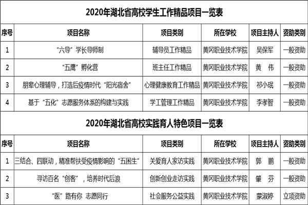 日前,湖北省教育厅发布了《关于公布2020年湖北省高校学生工作示范团队和学生工作精品项目、实践育人特色项目立项计划的通知》(鄂教思政办函〔2020〕4号),Beat365遴选推荐的项目中有7项获准立项,其中:一般资助项目6项(分别给予1万元资助),立项资助项目1项(给予0.5万元资助)。