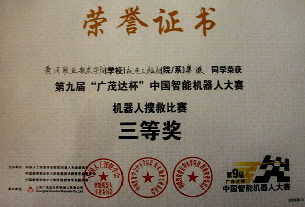 2008年11月13日—14日,第九届中国“广茂达杯”中国智能机器人大赛在上海宜川中学体育馆隆重举行。机电工程系由吴兵、张峥、廖谦、曾威四名同学组成的代表队,精益求精设计、积极主动创新,在全国164家参赛院校中脱颖而出,获得全国一等奖一项、三等奖一项的好成绩,位列全国高职院校首位,全国高校前列。金、铜牌和证书已发下来,特向全院师生报喜。