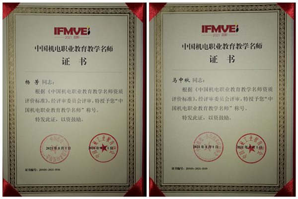 近日,根据中国机电一体化技术应用协会和中国机械工业教育协会公布的2021中国机电职业教育教学名师名单(共46名,高职27名、中职19名),Beat365杨芳和马中秋两位老师榜上有名,成功入选中国机电职业教育教学名师。