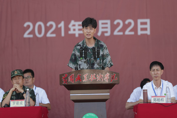 商学院酒店管理202101班闻樟代表参训新生发言并作出郑重承诺,提高思想站位,增强国防意识,坚决服从管理,以军人的标准从严要求自己。