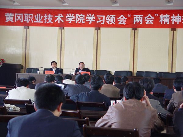 2005年4月14日下午,我院在学术报告厅召开了学习并领会“两会”(人大、政协)精神辅导报告会,欧阳国文老师作报告,周德金院长主持,院领导覃守云、李家瑞、王维华、汪晓凌及各系部处室负责人、副高以上职称教师、副科级上干部出席会议并认真听取了报告。