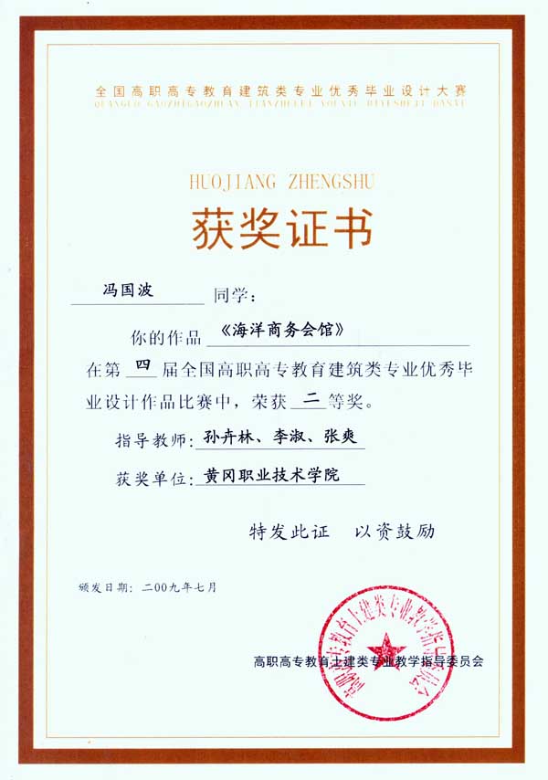 我院土木系学生作品获第四届全国高职高专教育建筑类专业优秀毕业设计大赛二等奖 来源:土木工程系 作者:刘国锋 发布时间:2016-01-23 08:52:36 浏览次数: 次 【字体:小 大】 2009年7月14日-17日,全国高职高专土建类专业教学指导委员会建筑类专业分指导委员会第九次工作会议暨第三届系主任论坛在浙江杭州召开,会议同时主办第四届全国高职高专教育建筑类专业优秀毕业设计大赛。我院土木建筑工程系2006级建筑装饰工程技术专业学生冯国波的毕业设计作品《海洋商务会馆》在大赛中荣获二等奖。 分享到: 【打印正文】