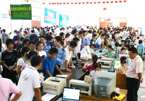 我院火爆迎新第一天 来源:宣传部 作者:朱建军 发布时间:2016-01-23 09:30:50 浏览次数: 次 【字体:小 大】 2009年新生第一天报到现场 近几年,我院迎新场面持续火爆。9月5日,是我院2009级新生报到第一天,迎新现场再度出现火爆场面,到晚上10:00止,已办理报到的普通专科生达到2830人。学工处、招生处、财务处、保卫处、后勤服务中心、各系部等部门迎新工作人员晚上11:00才结束工作。 据悉,今年,湖北省教育厅下达给我院普通专科招生计划3960人,计划数位居全省同类院校前列。从目前新生报到情况来看,我院圆满完成省教育厅下达的招生计划已无悬念。 志愿服务一瞥 分享到: 【打印正文】