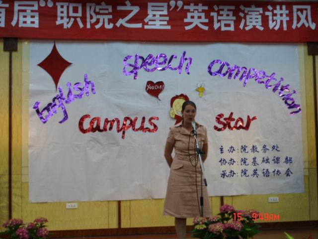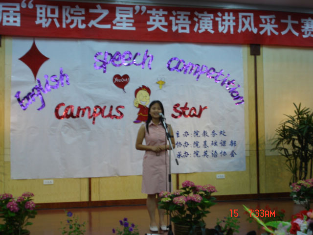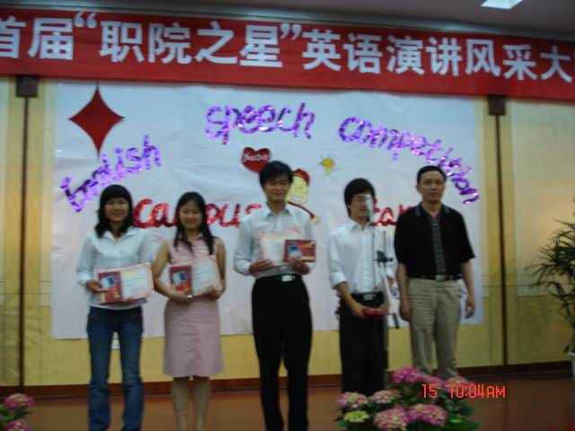 5月15日晚,我院首届“职院之星”英语演讲风采大赛决赛在我院学术报告厅隆重举行。副院长李家瑞同志应邀来到了比赛现场。院教务处李雪早、金为民两位处长、基础课部李卫光主任、各系团总支书记、学管主任以及四位外教Gary、Susan、Atticus和Kerry、英语教研室的十一位老师、院英语协会的成员、各社团的代表以及各系学生代表约200多人共同参加了本次活动。