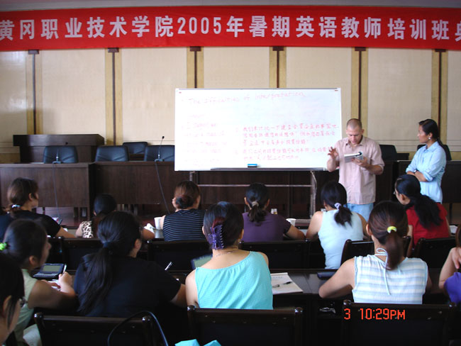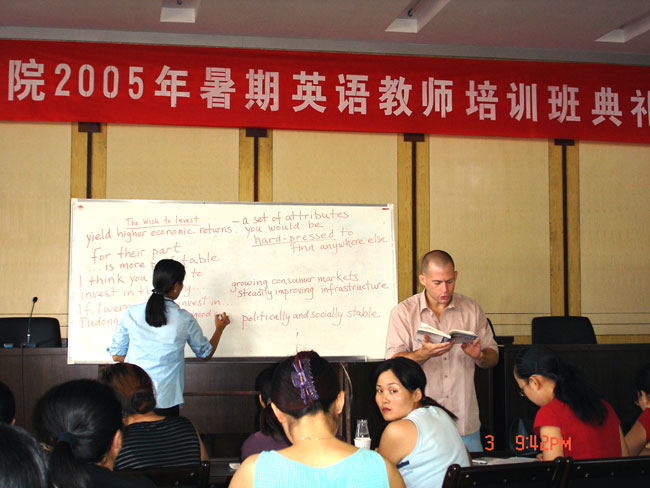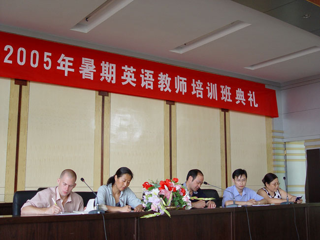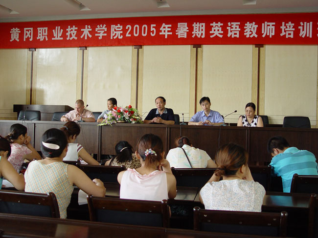 2005年7月3日上午八点整,由教务处、外事办公室、基础课部组织的暑期英语教师培训班在学术报告厅举行开班典礼。参加典礼的有教务处处长李雪早同志、外事办公室副主任、基础课部英语教研室副主任黄爱良同志、基础课部英语教研室副主任周游同志,外籍教师BETH和ATTICUS以及英语教研室二十多位教师参加了开班典礼。
