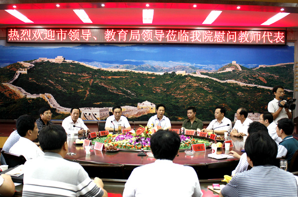 2010年9月9日下午,市委副书记沈景艳、市人大副主任张永斌、市政府副秘书长邱秉元、市教育局局长王建学等领导来我院看望慰问教师。市委副书记沈景艳在看望慰问教师时说:“在第26个教师节到来之际,我们一行代表市委、市人大、市政府、市政协来到Beat365中文官方网站看望慰问教师,通过学院领导和教师代表转达我们向全院教师的节日祝贺,并向全院教师表示崇高的敬意和良好的祝愿。”他强调了教师的重要作用和崇高使命,盛赞我院在高等职业教育领域取得的显著成就,对我院教师提出了殷切的希望。
