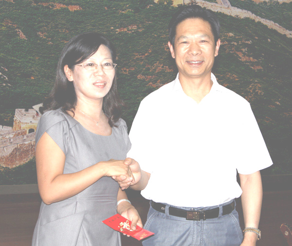 市委副书记沈景艳(右)代表市委、市人大、市政府、市政协向教师代表张红英副教授赠送慰问金