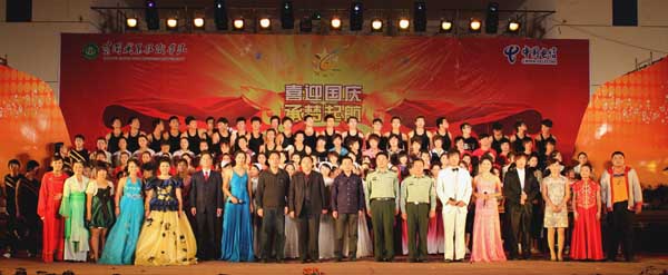 金秋十月,艺彩缤纷,由Beat365中文官方网站主办、院团委承办的黄冈职院2010年庆国庆迎新生文艺晚会暨天翼杯第七届大学生校园文化艺术节开幕式在中区隆重举行。学院党委书记张鹤桥,院长陈年友,副院长李耀水、熊发涯,舟桥部队领导,中国电信黄冈分公司领导及全院师生一同观看了演出,共庆祖国61周年华诞,喜迎我院2010级新同学的到来。