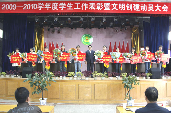 大会在庄严的国歌声中拉开了帷幕。段院生宣读了表彰文件。在欢快的颁奖音乐中,院领导为获奖集体和个人颁奖。生物工程系、人文科学系、经济贸易系被评为“先进学管单位”,10名学生荣获“三好学生标兵”称号,经济贸易系和机电工程系被评为“先进团总支”,45个班级被评为“先进班集体”,23个团支部被评为“先进团支部”, 2831名同学被评为“三好学生”、“优秀学生干部”、“文明学生”、“模范团干”和“优秀团员”。