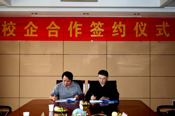 公司人力资源经理黄同友(右一)和机电系主任倪祥明(左一)代表双方签订校企合作协议