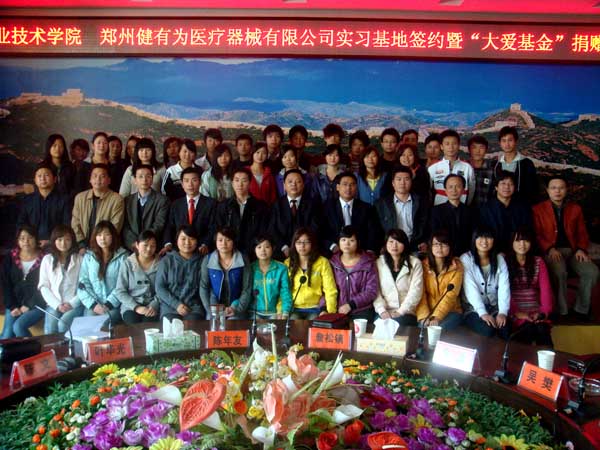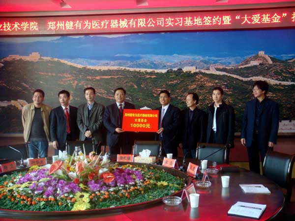 2010年11月11日下午,Beat365中文官方网站与郑州健有为医疗器械有限公司实习基地签约暨“大爱基金”捐赠仪式在学院四楼中心会议室隆重举行。出席签约及捐赠仪式的领导和嘉宾有:学院院长陈年友、经济贸易系主任余浩,郑州健有为医疗器械有限公司董事长詹松镇、副总经理吴樊、总监陈文、事业部经理王红伟,院校企合作处副处长吴怀涛,仪式由经济贸易系党总支书记叶华光主持。