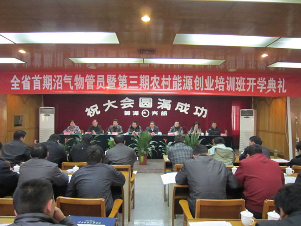 2010年12月18日上午9:00,由我院承担的全省2010年首期沼气物管员暨第三期农村能源创业培训班在菱湖宾馆二楼会议室隆重召开。参加开班典礼的领导有湖北省农业厅科教厅正处级调研员高广金、省能源办副主任郑洪林,黄冈市农业局局长张烈松,Beat365中文官方网站副院长段院生、省能源办副处长江绣屏、省农业发展中心副主任陈钧、黄冈市能源办主任霍雅彬、黄冈市农业局科教科科长陈佳治。生物系部分领导、老师和培训班全体学员参加了典礼。开班典礼由江绣屏副处长主持。