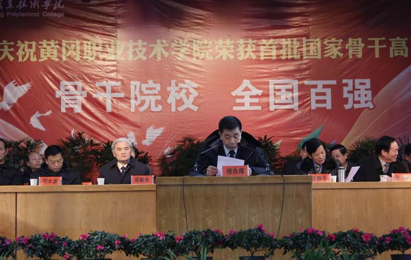 12月26日上午,我院荣获首批国家骨干高职院校建设单位庆典活动在院大学生活动中心隆重举行。参加庆典的市领导有:市委常委、常务副市长王静平,市委常委、宣传部长邓新华,市人大副主任张永斌,市政协副主席李儒志等;嘉宾有黄冈师范学院党委书记程水源,黄冈开发区管委会主任黄永文,鄂东职院党委书记、院长饶水林,黄冈科技职院、市直各单位的领导,各县市区分管教育的副县(市、区)长、教育局局长及分管教学的副局长、招办主任、高中(中专)校长,黄冈职院校企合作单位代表等。学院离退休老领导应邀参加了会议。副市长梅香雪主持大会。