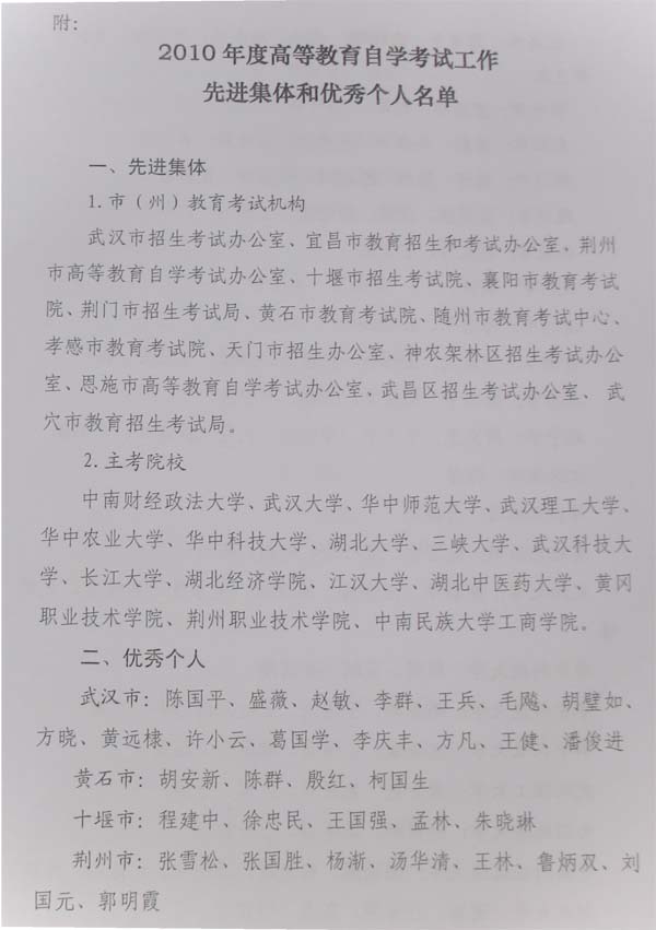 我院荣获2010年度湖北省高等教育自学考试工作先进集体,张世勇、徐小平荣获先进个人荣誉称号。