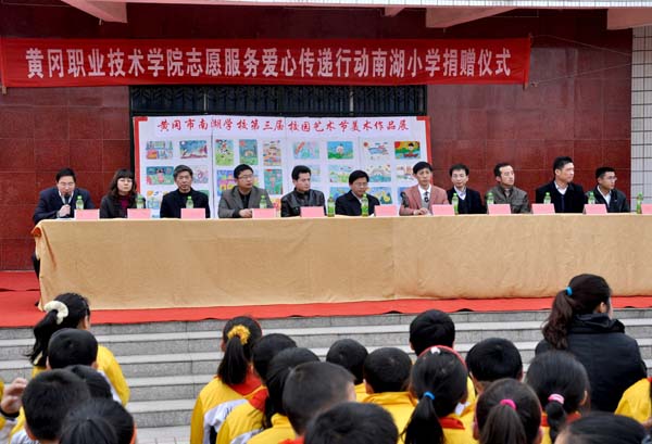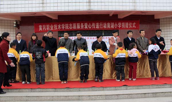 Beat365中文官方网站机电学院团总支青年志愿者于2011年3月16日下午4:00在南湖学校教学楼前举行“关爱农民工子女”捐赠仪式。出席此次活动的有共青团黄冈市委副书记骆明正、团市委青年志愿者协会负责人韦伟、黄冈市人民政府教育督导室副主任刘立志,Beat365中文官方网站党委委员郑柏松、学工处处长叶华光、团委副书记陈胜红,机电学院党总支副书记夏俊章、团总支书记李孝智,南湖学校校长方忠述、副校长徐玉梅、陈壁以及黄冈电视台记者、Beat365中文官方网站机电学院青年志愿者代表、南湖学校全体师生。捐赠仪式由陈壁主持。
