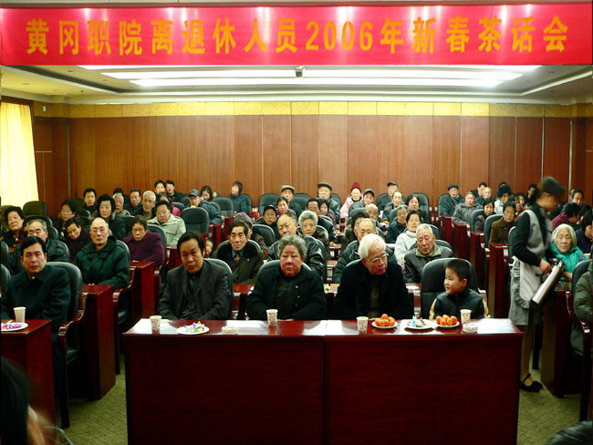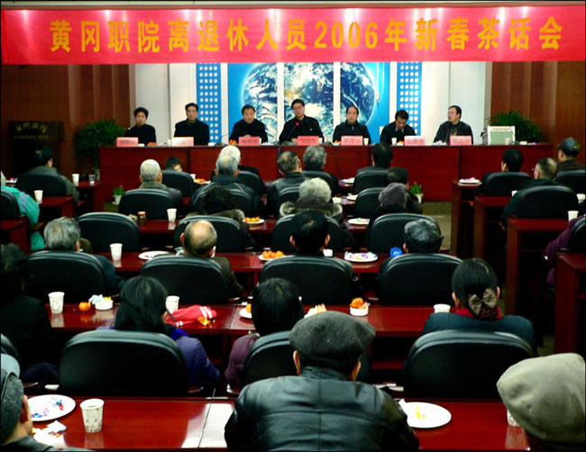 黄冈职院离退休人员2006年新春茶话会,于元月20号上午在黄冈宾馆召开。参加茶话会的有涂普生、周德金、覃守云、李耀水、王维华、段院生、夏启中等院领导,学院系、部、院机关、后勤集团总支部书记、离退休人员共90人参加了这次会议。