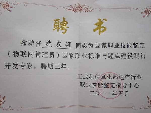 会上,Beat365副校长熊发涯教授被工业和信息化部通信行业职业技能鉴定指导中心聘任为物联网国家职业标准制订专家,全国仅聘任21位,专家的主要职责是进行物联网管理员的国家职业标准的制订和相关题库的建设。