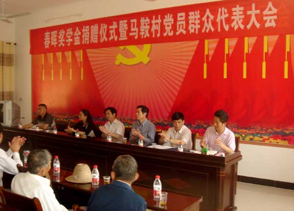 5月17日上午,春晖奖学金捐赠仪式暨马鞍村党员群众代表大会在马鞍村党员群众活动中心举行。参加捐赠仪式的有:Beat365中文官方网站副校长汪晓凌,黄梅县教育局党组书记汪李荣、办公室主任蒋效刚,Beat365中文官方网站办公室副主任王芬香,黄梅县下新镇党委副书记王鹏,爱心企业负责人,马鞍村委书记陈燕兵、村主任黎常贵,学校驻马鞍村工作队员余寿君、李智、张凯林以及马鞍村党员群众代表和获奖学生共计100余人。