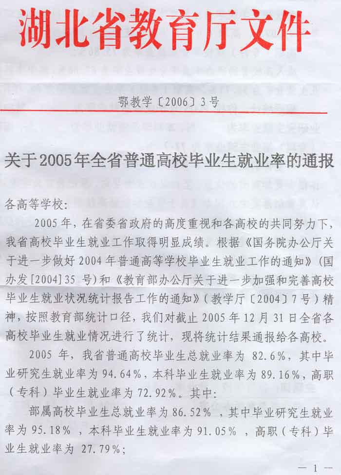 根据湖北省教育厅鄂教学[2006]3号文件《关于2005年全省普通高校毕业生就业率的通报》提供的相关信息,我院2005届毕业生就业率为98.7%,比全省普通高校毕业生总就业率82.6%高出16个百分点,比全省高职(专科)毕业生就业率72.92%高出25个百分点,我院2005届毕业生就业率列全省高校第一,实现了毕业生就业率连续三年过98%的目标。特向全院师生员工报喜!