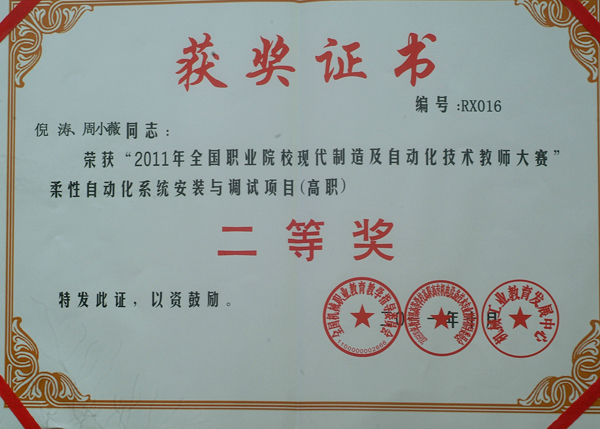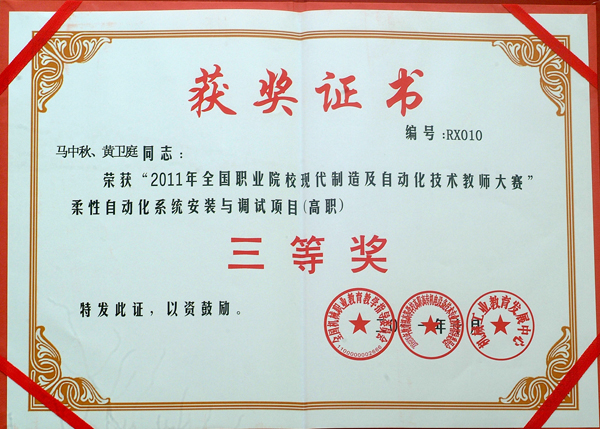 全国首届“职业院校现代制造及自动化技术教师大赛”于2011年10月28至30日在浙江机电职业技术学院隆重举行。Beat365机电学院组织2个教师代表队参加此次大赛,经过参赛教师的团结协作、奋力拼搏,在激烈的竞争中喜获佳绩。倪涛、周小薇代表队获得“柔性自动化系统安装与调试”项目比赛全国二等奖,黄卫庭、马中秋代表队获得该项目比赛全国三等奖。同时,倪涛、周小薇老师分获“全国机械职业院校人才培养优秀教师”荣誉称号。