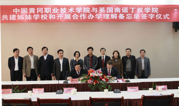 12日下午,共建姊妹校和开展合作办学理解备忘录签字仪式在黄冈宾馆会展中心四楼会议室隆重举行。校长陈年友、副校长段院生、校长助理、医药卫生学院院长刘东山、学校办公室主任刘明涛、交通学院院长张红英、商学院院长袁畅、电子信息学院罗幼平、生物化工学院院长陈全胜、机电学院院长倪祥明、建筑学院院长刘晓敏及部分专业负责人参加了仪式。宾主双方致辞,陈校长与安迪摩尔执行董事签字并互换备忘录。签字仪式后,双方举杯进行了庆祝。