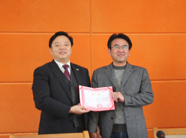 校长陈年友为黄冈市畜牧局局长凌家瑞颁发理事长聘书