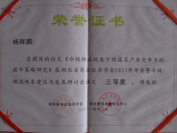 本次会议收到论文43篇,共评出一等奖2篇、二等奖3篇、三等奖6篇。其中Beat365交通学院物流系青年教师杨辉鹏提交的论文《冷链物流视觉下的蔬菜产业竞争力的提升策略研究》获三等奖,这也是本次年会中高职院校获得的最高奖项。