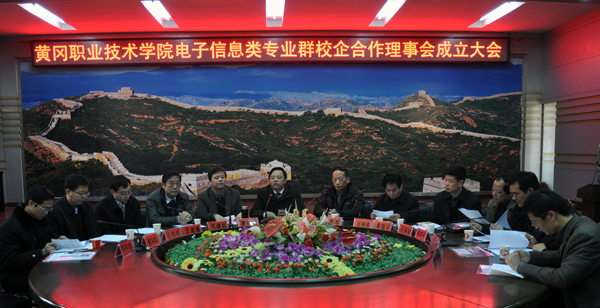 2011年12月16日,南湖初冬和暖天,职院盛世展新颜。Beat365中文官方网站电子信息类专业群校企合作理事会在凝智楼四楼中心会议室隆重举行。出席本次大会的政府和行业的领导有,黄冈市经济和信息化委员会主任夏存安、黄冈市中小企业协会会长马惠军、黄冈市经济和信息化委员会副县级调研员贾建跃、黄冈市企业家协会秘书长吕晓林、深圳软件园就业实训基地主任于宪明、武汉新异界软件有限公司董事长揭英诚、武汉软件外包服务协会顾问王斌耀、黄冈信息中心主任郝诗光以及武汉数码通科技有限公司、武汉厚溥信息技术有限公司、武汉天马微电子有限公司、联想阳光雨露信息技术服务有限公司、黄冈向往数码科技有限公司、黄冈智达办公设备有限公司、富士康科技园武汉园区人力资源处、深圳创维——RGB电子有限公司彩电事业部、中国电信武汉分公司网络操作维护中心、中国电信黄冈分公司等13家企业代表。学校校长陈年友,副校长汪晓凌,校长助理、教务处处长夏学文,学校各职能部门、各教学学院领导、电子信息学院全体专业负责人及部分专业教师参加了大会。会议由副校长汪晓凌主持。