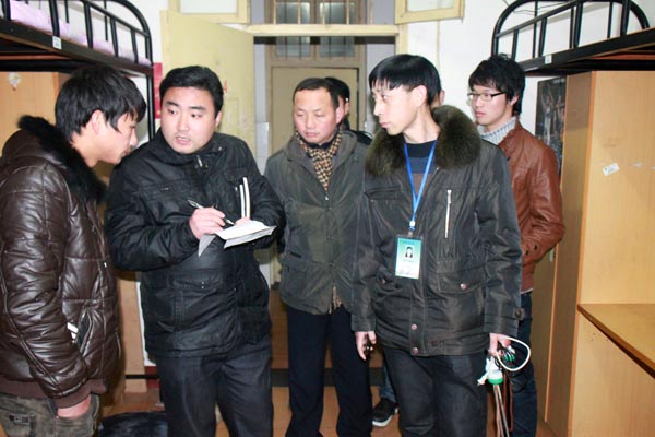 安全检查过程中,郑柏松深入到中6舍、中7舍、中8舍、中10舍现场视察检查工作。每到一幢宿舍楼,都细心观察检查各种线路是否有隐患存在,耐心询问楼管员是否发现异常情况。每到一间宿舍,都反复叮咛学生要注意安全用电,做到防火防盗。针对目前安排在外实习的学生,郑柏松着重强调辅导员要加强管理,掌握学生返校的状况,做到与学生每天一见面,信息每天一更新,楼栋管理员要掌握学生返校时间,为学生住宿做好保障,并时刻关注学生在宿舍的情况,以便解决学生之需。