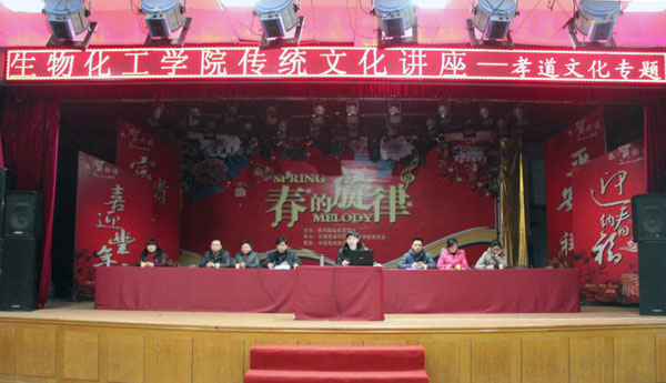 为了促进校园文化建设,弘扬传统文化精神,3月5日晚上,生物化工学院全体在校生在大学生活动中心聆听了校党委委员郑柏松关于“中国传统文化——孝道文化”为主题的专题讲座。生物化工学院党总支副书记程喜荣,学工处副处长徐火军、李宁,学工处科长吕晓霞,生物化工学院全体学生工作人员参加了本次讲座。大会由生物化工学院党总支书记余亮彬主持。