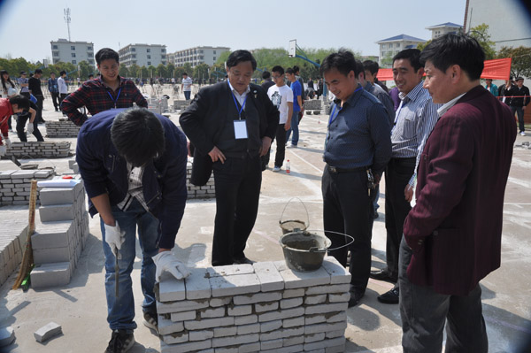 校长陈年友、副校长段院生、校长助理刘东山等在建筑工程技术专业工种技能操作测试现场