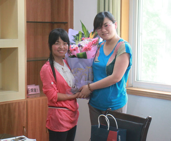 座谈正式开始之前,在热烈的掌声中,张鹤桥代表学校向王定同学颁发了“最佳校园之星”的荣誉证书,并赠送一双安踏旅游鞋,祝愿王定同学在以后的人生道路上一路平安,一生顺利。团委吕晓霞科长代表全校广大青年为王定同学献上了鲜花。