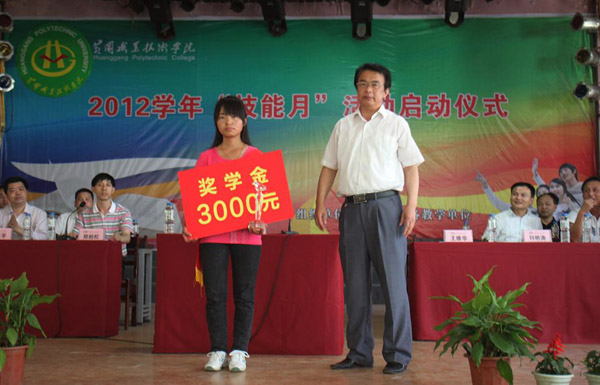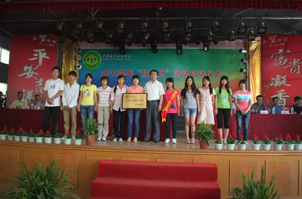 在庄严的国歌声后,办公室主任刘明涛首先宣读了《关于表彰“最佳校园之星”的决定》,教务处副处长方玮宣读了《关于授予旅游管理201101班“优秀实习团队”称号的表彰决定》。校党委副书记王维华为王定同学颁发了奖杯和3000元奖学金,并为“优秀实习团队” 颁发了奖牌。