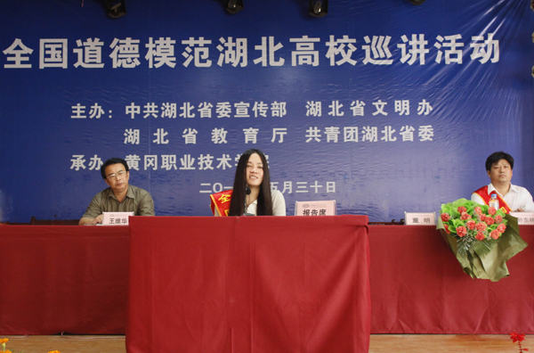 报告会由党委委员郑柏松主持。他在总结讲话中说:三位全国道德模范来到Beat365中文官方网站,带来了他们的感人事迹,带来了他们的心路历程,更带来了他们的精神魅力和道德感召力。三位全国道德模范的真情讲述在平凡中见伟大,从中我们读出了对家、国、天下的担当,看到了真、善、美的中华美德,更感受到了社会主义核心价值的时代力量。全国道德模范代表走进革命老区大别山,为Beat365中文官方网站两万余名师生带来了丰富的精神食粮。希望全体师生员工以全国道德模范为榜样,秉承革命老区的优良传统,爱岗敬业、乐于奉献、教书育人,希望各位同学认真学习他们的崇高精神,传播优秀道德文化,成长为信念执着、品德优良、知识丰富、本领过硬、开拓创新的高端技能型人才,为中华民族的伟大复兴而努力奋斗,用优异的成绩喜迎党的十八大胜利召开。