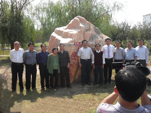 校长陈年友与88级特产班老师在景观石前合影
