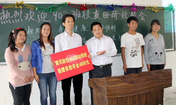 校友们表达了自己对母校的深厚感情,感谢母校的培养和教育。原黄冈农校88级特产班的校友为学校捐赠了景观石一块,采自云南红火石,景观石上面刻写着“师恩似海”,校长陈年友参加了揭幕仪式,这块景观石成为育贤阁门前一道独特的风景线;原黄冈财校841班、901班校友向学校捐赠了现金;原黄冈财校902班校友举行了向品学兼优和家庭贫困学生的捐助活动。校友传达了其对母校及恩师的感恩之情,校友们毕业后不忘母校恩情,献出爱心回馈母校的精神难能可贵。