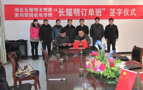 2012年12月11日下午,机电学院与湖北长耀明太阳能股份有限公司在学院会议室举行校企合作、订单培养签约仪式。湖北长耀明太阳能股份有限公司总经理张琰、光热联盟副秘书长陈栋、技术部部长袁春林、办公室主任倪琳,机电学院总支书记丁茂喜、院长倪祥明、副院长黄国祥、能源系主任祁小波及专业团队负责人姜永豪出席了签约仪式。