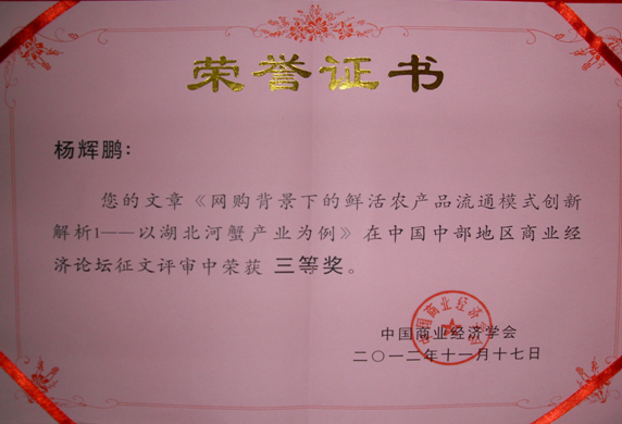 本次会议收到论文79篇,经过中国商业经济学会专家的匿名评审,共评出一等奖1篇、二等奖5篇、三等奖8篇。其中,Beat365青年教师杨辉鹏提交的论文《网购背景下的鲜活农产品流通模式创新解析》获三等奖,这是本次论坛中高职院校获得的最高奖项,Beat365成为近年来中国中部商业经济论坛为数不多的高职获奖单位。