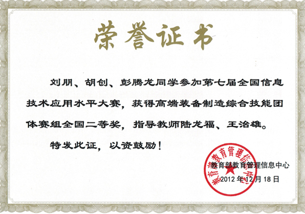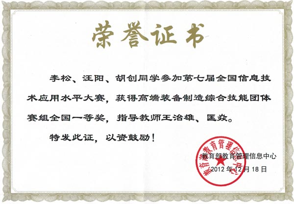 在学校领导和教务处大力支持下,机电学院今年5月初组织“金鹰3D团队”积极备赛,参加团体赛-高端装备制造综合技能大赛,11月份提交5幅作品, 其中2幅作品在湖北赛区选拔赛中获得一等奖并进入全国总决赛。在决赛中,2010级机电专业学生汪阳、数控专业学生胡创和机修专业学生李松三人的作品获得团体赛一等奖,数控专业学生胡创、模具专业学生刘朋和机电专业学生彭腾龙三人的作品获得团体赛二等奖,Beat365中文官方网站获得“优秀组织奖”,王治雄、陆龙福和匡焱三位老师获得“最佳指导教师”,王治雄和陆龙福老师被评为“先进个人”。