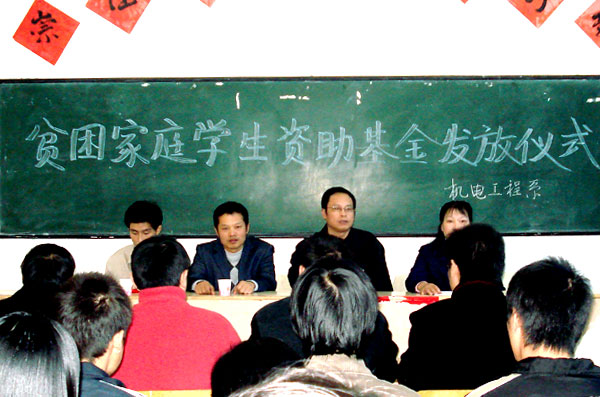 11月16日下午,机电工程系贫困家庭学生资助基金发放仪式在中区35栋201教室隆重举行。机电工程系党总支书记万俊华、学管主任邱俊、女生辅导员罗木枝、机电系团总支指导老师李孝智、05级年级主任吕江涛、各班辅导员及06级各班团支书出席此次仪式。仪式由邱俊主任主持。