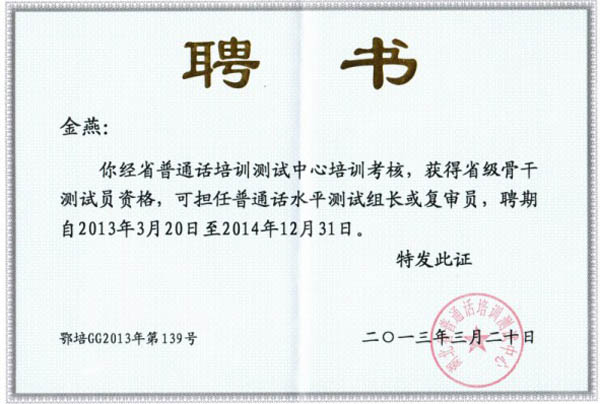 会上,省测试中心主任曹艳丽宣读了获得2013-2014年度骨干测试员资格人员名单,Beat365金燕、熊宝莲老师同时通过了省普通话培训测试中心组织的业务培训和考核,获得省级骨干测试员资格,将可担任普通话水平测试组长或复审员。