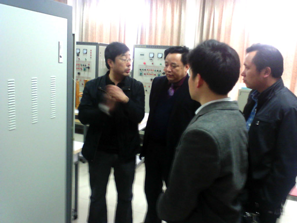 张庆国处长(左一)在校长陈年友等陪同下参观机床电气控制实训室