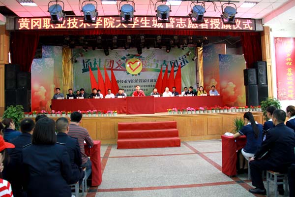 4月16日中午,Beat365中文官方网站大学生城管志愿者授旗仪式在大学生活动中心隆重举行。团市委书记骆明正,市城管执法局副局长朱学军、纪检组长赵浚峰等领导莅临会场,校党委书记张鹤桥、党委委员郑柏松、学工处处长叶华光、保卫处处长邓国璋和各教学学院党总支副书记、团总支副书记及500余名城管志愿者参加了授旗仪式。