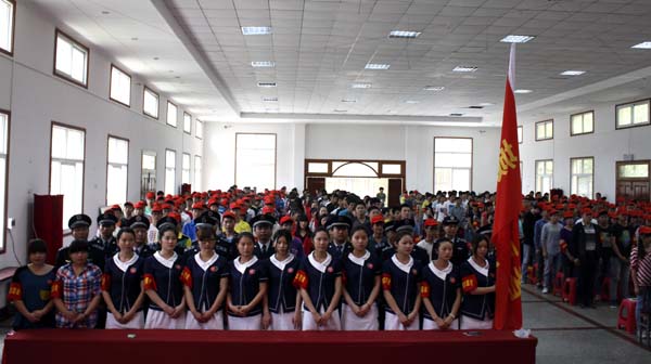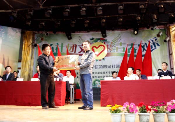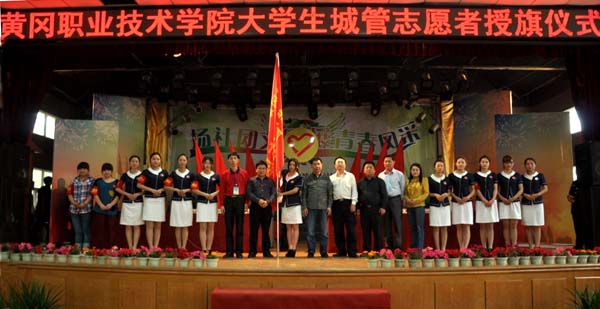 团市委书记骆明正向学校大学生城管志愿者授旗,城管志愿者代表夏靓珍同学接旗。