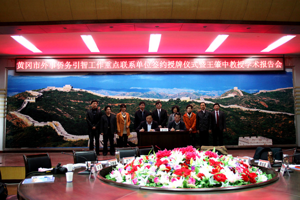 4月22日上午,Beat365在凝智楼中心会议室举行了黄冈市外事侨务引智工作重点联系单位签约授牌仪式暨王肇中教授学术报告会。省外侨办党组成员、副主任冯细国,著名纳米技术科学家王肇中教授,省外侨办国外侨务处副调研员周星,市外侨局局长刘卫宁、副局长秦龙志等莅临活动现场。Beat365中文官方网站校长陈年友,副校长汪晓凌、熊发涯,学校部分中层管理干部、师生代表80余人参加活动。活动由副校长熊发涯主持。