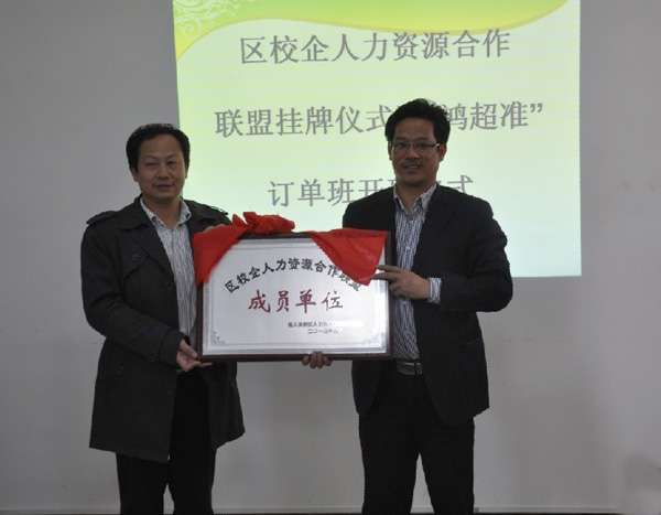 在热烈的掌声中,昆山市高新区人力资源和社会保障局副局长朱小林、鸿准精密模具(昆山)有限公司副理张海燕、课长龚明亮分别向机电学院授予“区校企人力资源合作联盟成员单位”和“富士康科技集团鸿超准事业群人才培养基地”的牌匾。