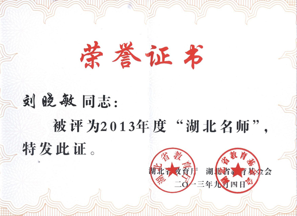 刘晓敏教授荣获2013年“湖北名师”称号,既是对他个人工作业绩的肯定,更是对Beat365办学成就的充分肯定。