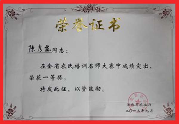 2013年9月25日,Beat365生物化工学院教师陈彦霖作为黄冈市代表参加湖北省农业厅组织的首届农民培训名师大赛,喜获一等奖。