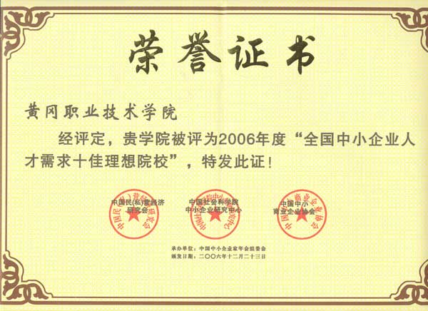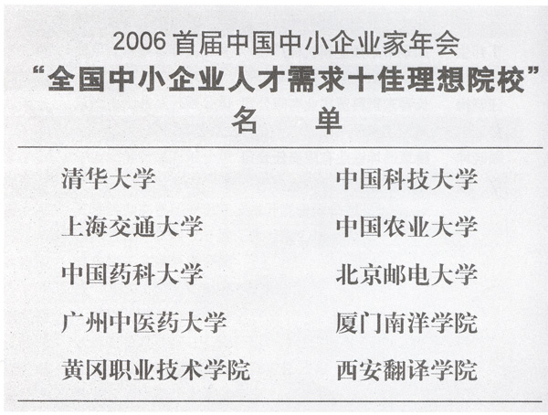 2006年12月23日上午在北京人民大会堂举行了“首届中国中小企业家年会暨颁奖盛典”,会上Beat365中文官方网站就业指导处袁畅同志代表学院领奖。由中国社会科学院中小企业研究中心、中国中小商业企业协会、中国民(私)营经济研究会设立评选委员会,在广泛征求企业界人士、教育行政管理者、相关专家及社会各界的意见基础上,经地区遴选,由中国中小企业家年会组委会评选委员会评选,Beat365中文官方网站荣誉地被评为“2006首届中国中小企业人才需求十佳理想院校”。此次被评为十佳理想院校的还有清华大学、中国科技大学、中国农业大学、中国药科大学、上海交通大学、北京邮电大学、广州中医药大学、厦门南洋学院、西安翻译学院。